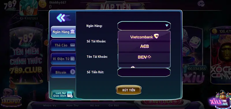 Rút tiền 789club qua ngân hàng là phương thức phổ biến nhất, đặc biệt phù hợp cho những người dùng muốn chuyển tiền trực tiếp về tài khoản ngân hàng cá nhân. Hệ thống hiện đã liên kết với nhiều ngân hàng lớn tại Việt Nam như BIDV, Agribank, Vietcombank, Sacombank, Techcombank, và rất nhiều ngân hàng khác, cho phép giao dịch nhanh chóng và an toàn.